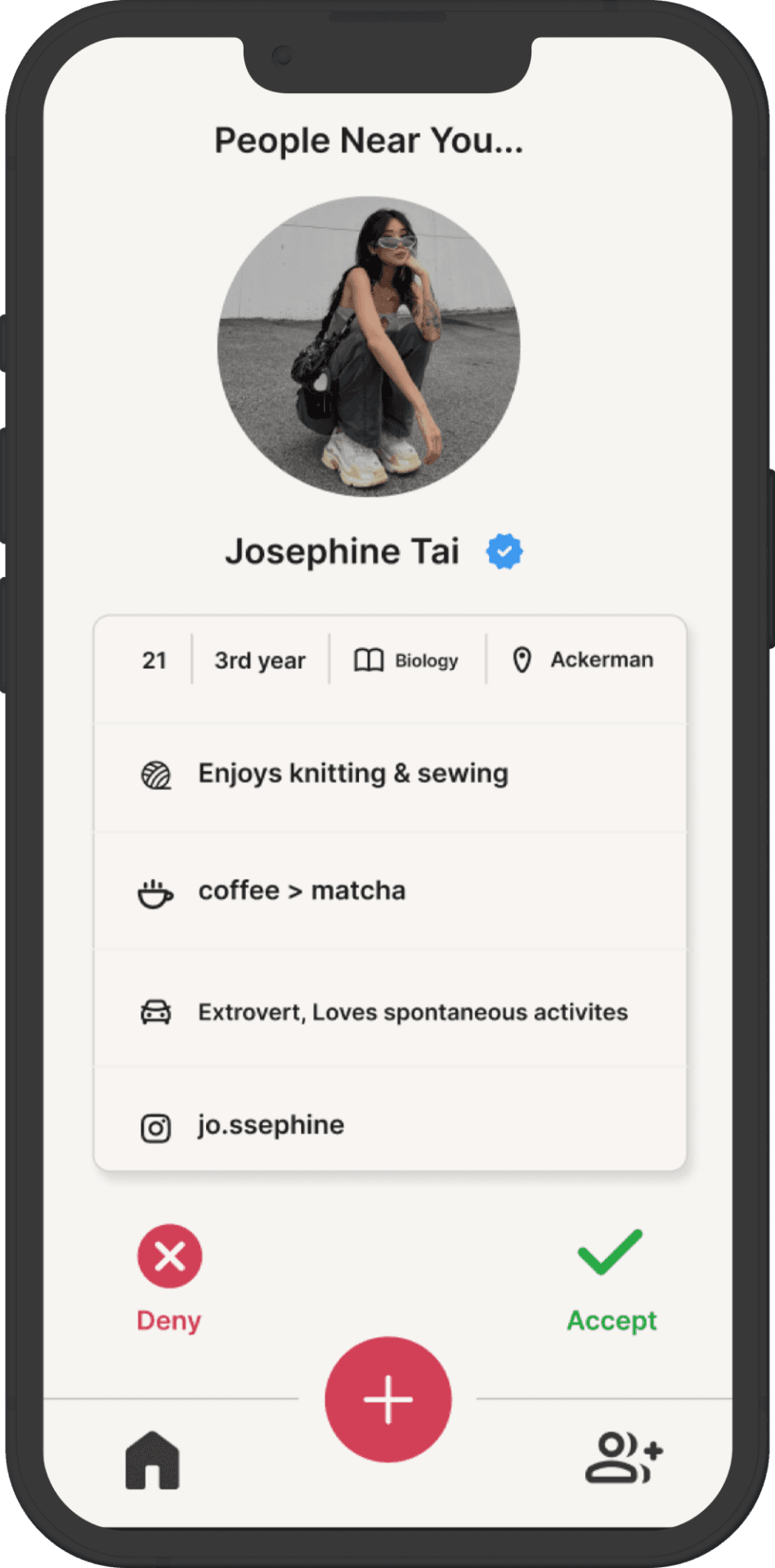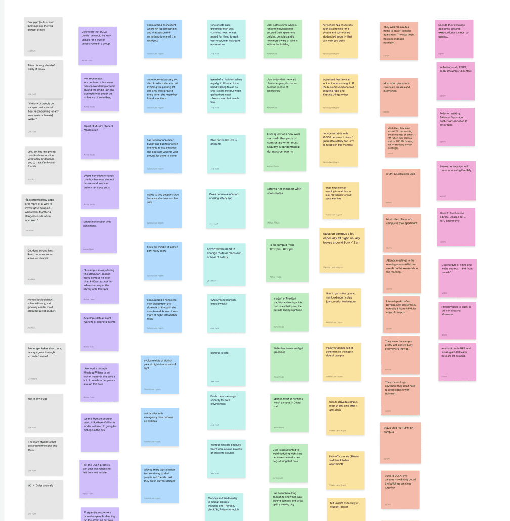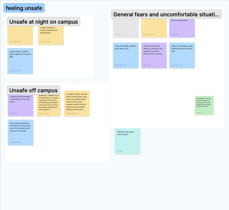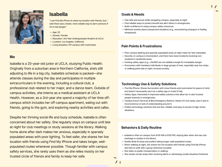 To better visualize our key insights, we created a user persona, focusing on a third-year female college student attending UCLA, she often faces fears concerning her safety and walking home alone after dark due to her busy schedule and staying on campus late at night. This persona helped us understand our user's need and to focus on creating an app centered around the idea of location sharingand finding a friend to walk with