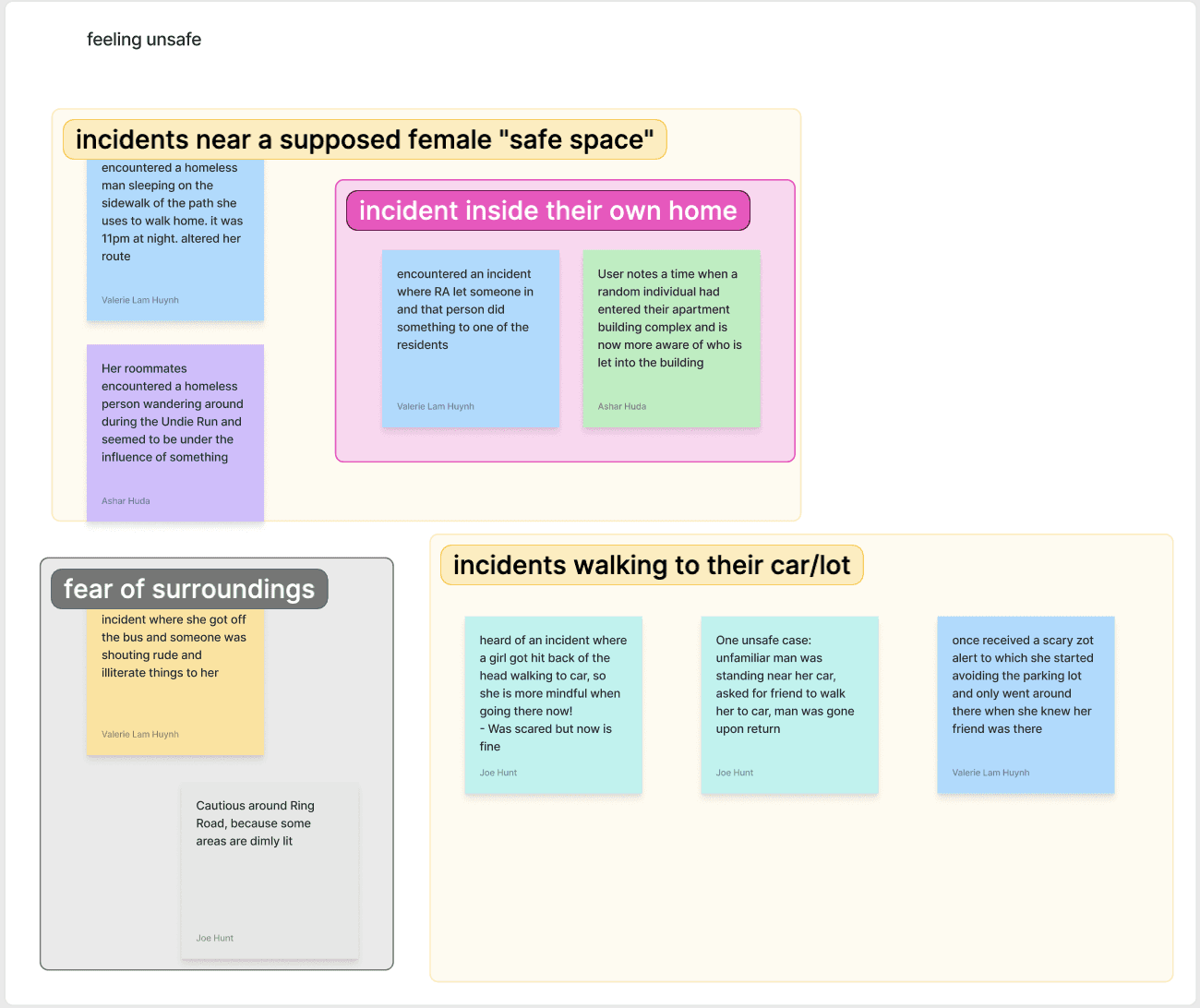 We conducted interviews , sampling the viewpoints college students had towards campus safety, how they got back home on a day to day basis, and what goals they had for combatting environments where they felt unsafe.