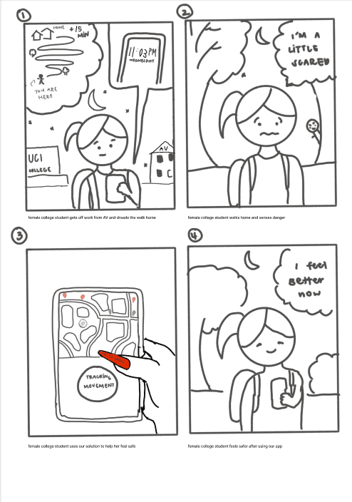 We created storyboards depicting various scenarios in which female college students might need immediate safety assistance or information, and how our safety app could address these challenges. These storyboards helped usexplore potential solutions without defining a single, rigid approach. Our personas played a key role in shaping these scenarios, as they provided valuable insights into the specific needs and preferences of our target users, ensuring that our solutions are relevant and tailored to their safety concerns.